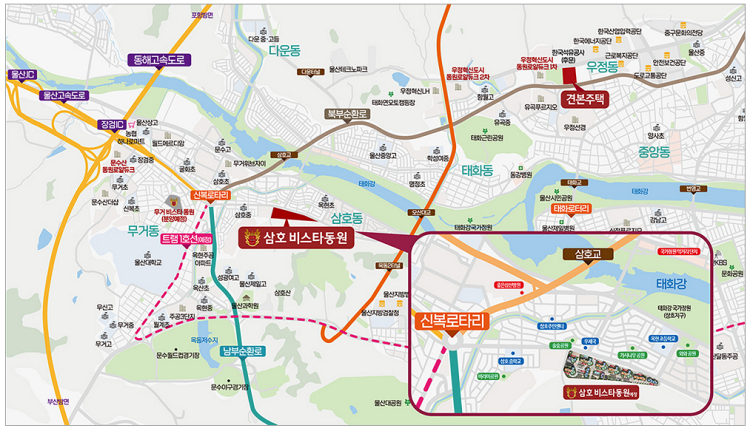 삼호 비스타동원이 들어설 남구 무거동은 트램 1호선 예정지로, 역세권 개발 호재가 기대되는 곳입니다. 기존 교통망 또한 우수하여, 무거동 신복로터리와 남북부순환도로, 삼호교를 따라 울산 시내지역으로 빠르게 이동이 가능합니다. 울산 IC를 이용하면 부산, 양산, 포항, 경주 등 인근 주요 도시 접근이 편리합니다.
